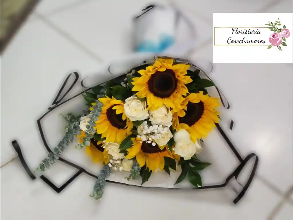 Bouquet de girasoles y rosas blancas con papel coreano