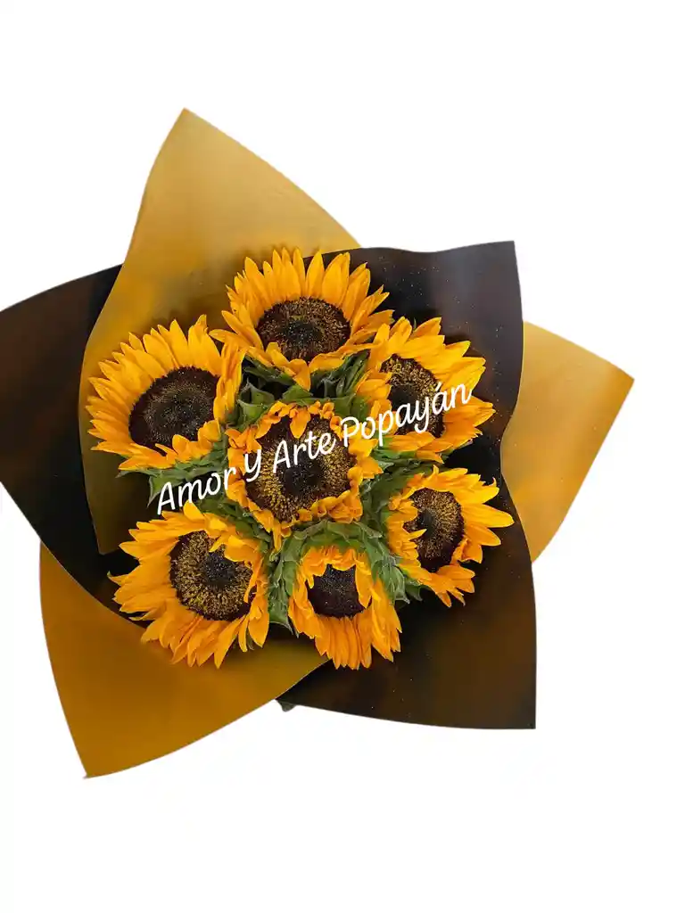 Ramo buchón destacando la belleza de los girasoles. Incluye: Tarjeta con mensaje personalizado, moño, aroma y briilo.