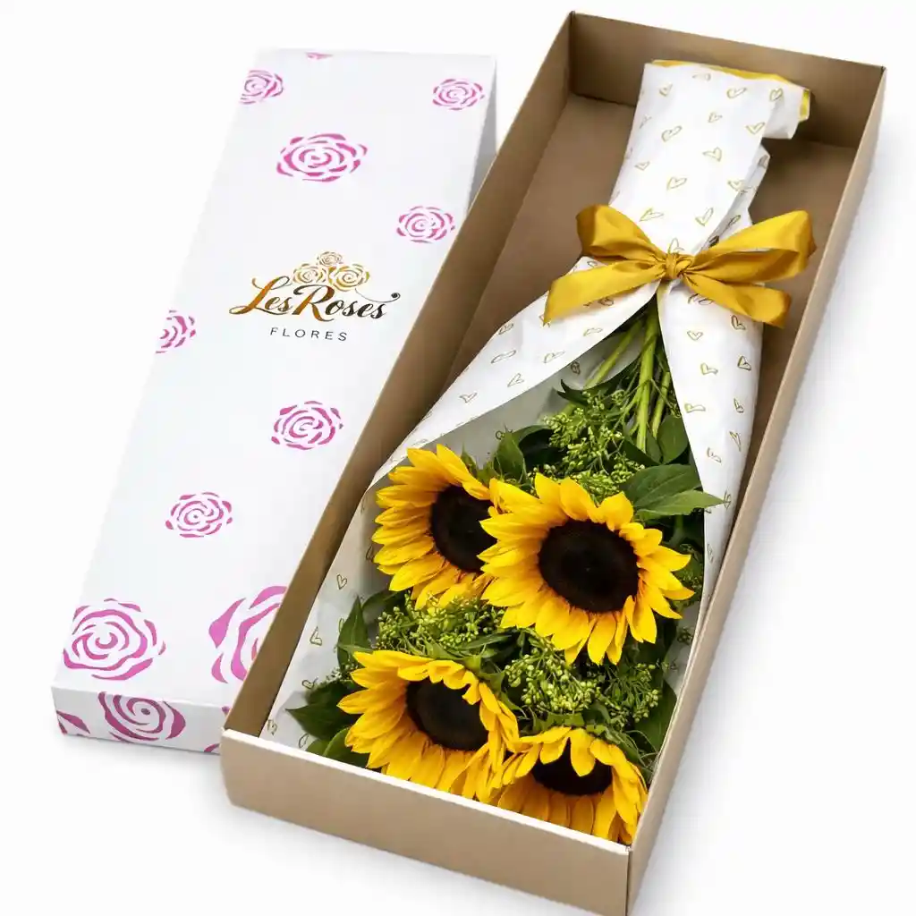 Caja floral exclusiva con 4 unidades medianos de girasoles