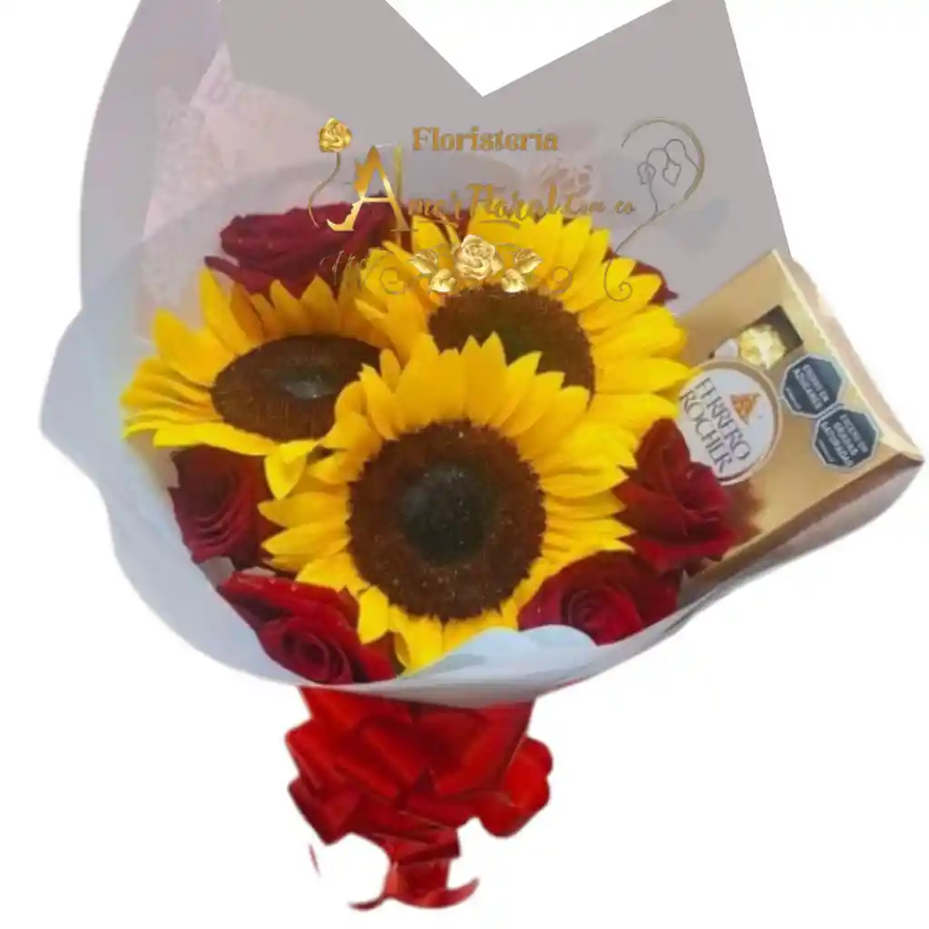 bouquet por 12 rosas, 3 girasoles, ferrero por 4 unidades, si deseas un mensaje para la tarjeta lo puedes dejar escrito en el área de observaciones o escribirnos al whatsapp al 3143111616 y enviarnos el mensaje para la tarjeta.
