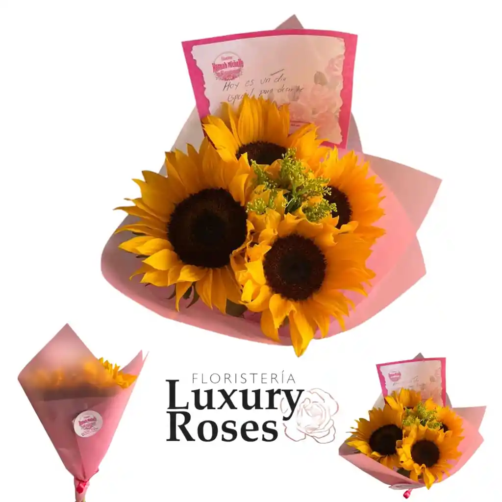 BOUQUETH DE 4 GIRASOLES, FOOLAJE PAPE LKOREANO Y MOÑO