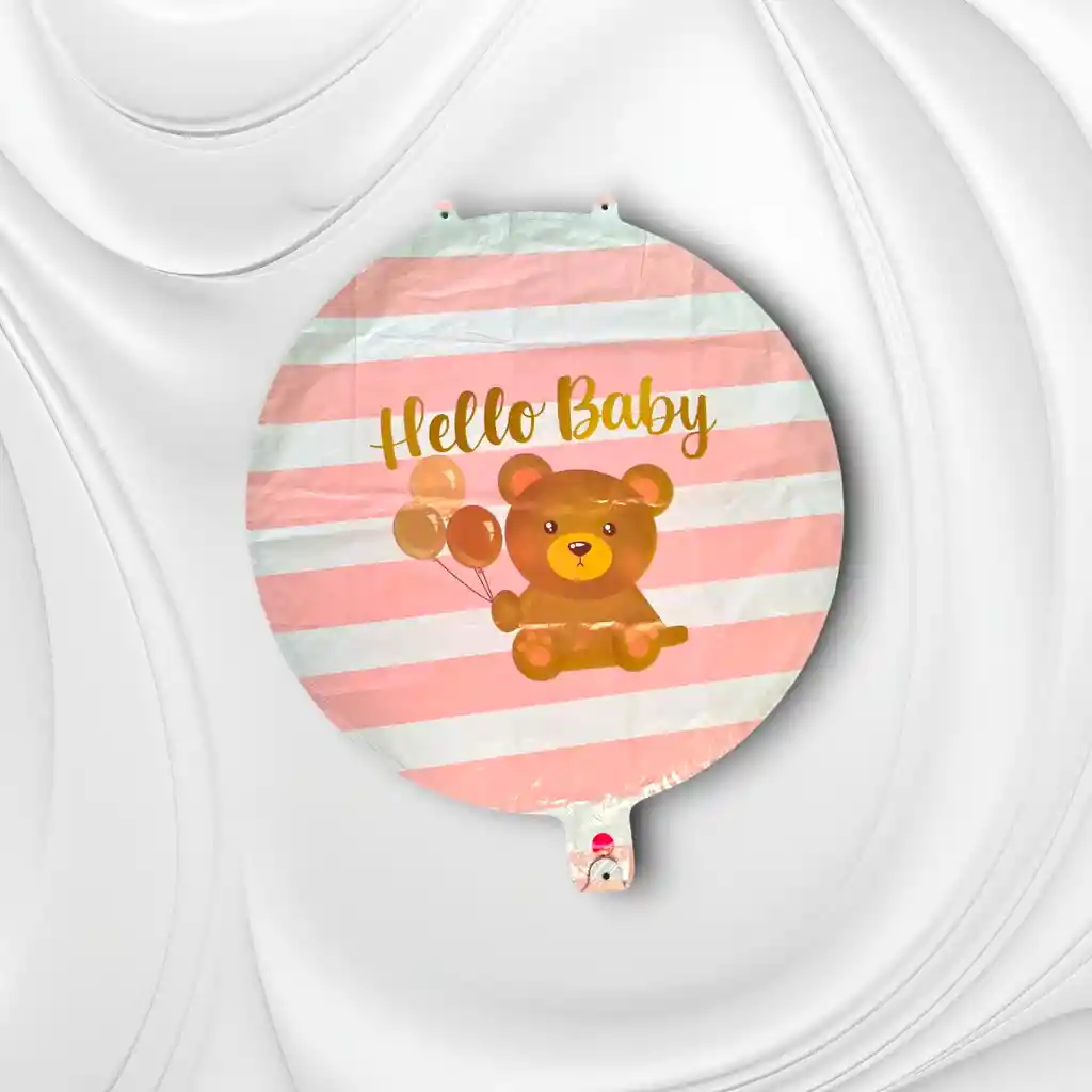 Globo redondo grande "No contiene helio" con delicadas franjas en tonos rosa, el mensaje “Hello Baby” ideal para: baby shower y bienvenida de bebé 🍼, celebraciones de nacimiento o revelaciones de género 🎀