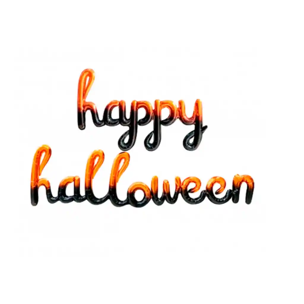 Globo inflable con diseño de letrero cursivo “Happy Halloween” en colores naranja y negro, perfecto para decorar tus fiestas con estilo festivo y elegante. Ideal para colgar o colocar en centros de mesa y crear un ambiente alegre y temático.
