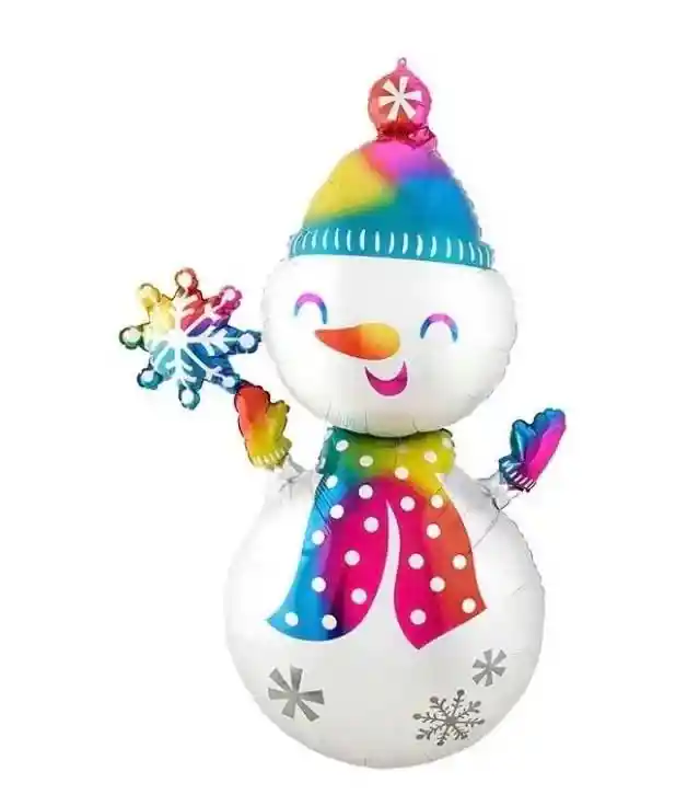 Globo Metalizado muñeco de nieve sonriente con un sombrero y bufanda de colores vibrantes y un copo de nieve en la mano. Estos globos se usan comúnmente como adornos navideños para fiestas o eventos.