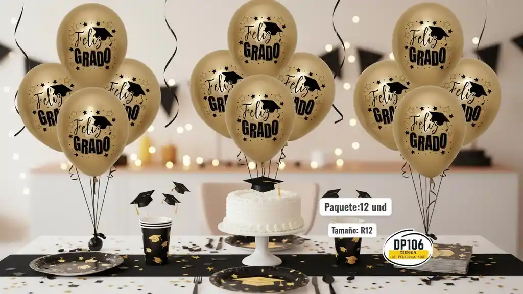 la frase de grado puede variar . 12 globos color dorado . tamaño R12