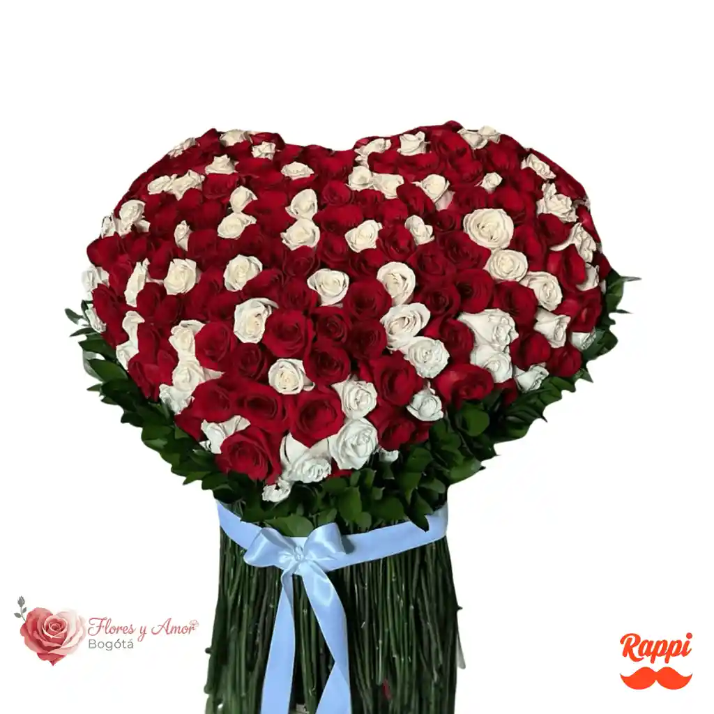 Un majestuoso arreglo en forma de corazón elaborado con una abundante combinación de rosas rojas y blancas, cuidadosamente organizadas para crear un diseño impactante y lleno de significado. Las rosas rojas representan pasión y amor profundo, mientras que las blancas simbolizan pureza y sinceridad, logrando un contraste elegante y armonioso. Su imponente tamaño y estructura definida en forma de corazón lo convierten en el detalle perfecto para declaraciones de amor, aniversarios, propuestas o fechas realmente especiales. El acabado con follaje verde natural y delicado lazo decorativo aporta frescura y un toque sofisticado que realza aún más su presencia. Un arreglo diseñado para quienes desean sorprender en grande y expresar sentimientos intensos de una manera inolvidable.