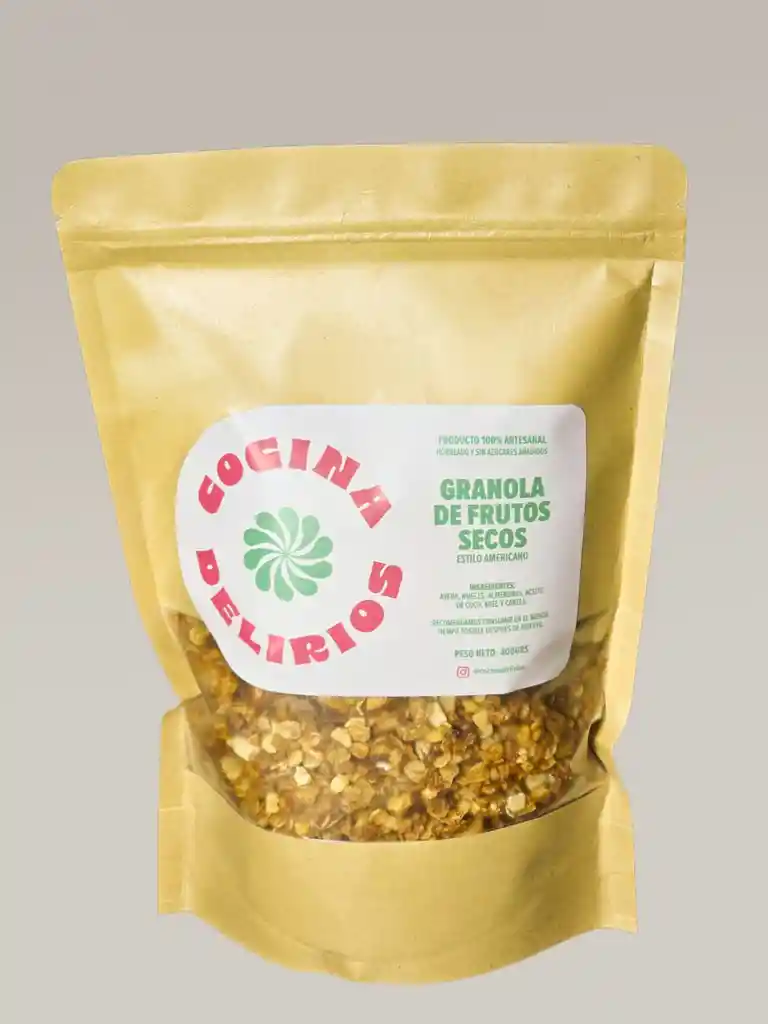 400 grs de Granola artesanal de frutos secos. Contiene nueces, almendras, avena, aceite de coco, miel y canela.