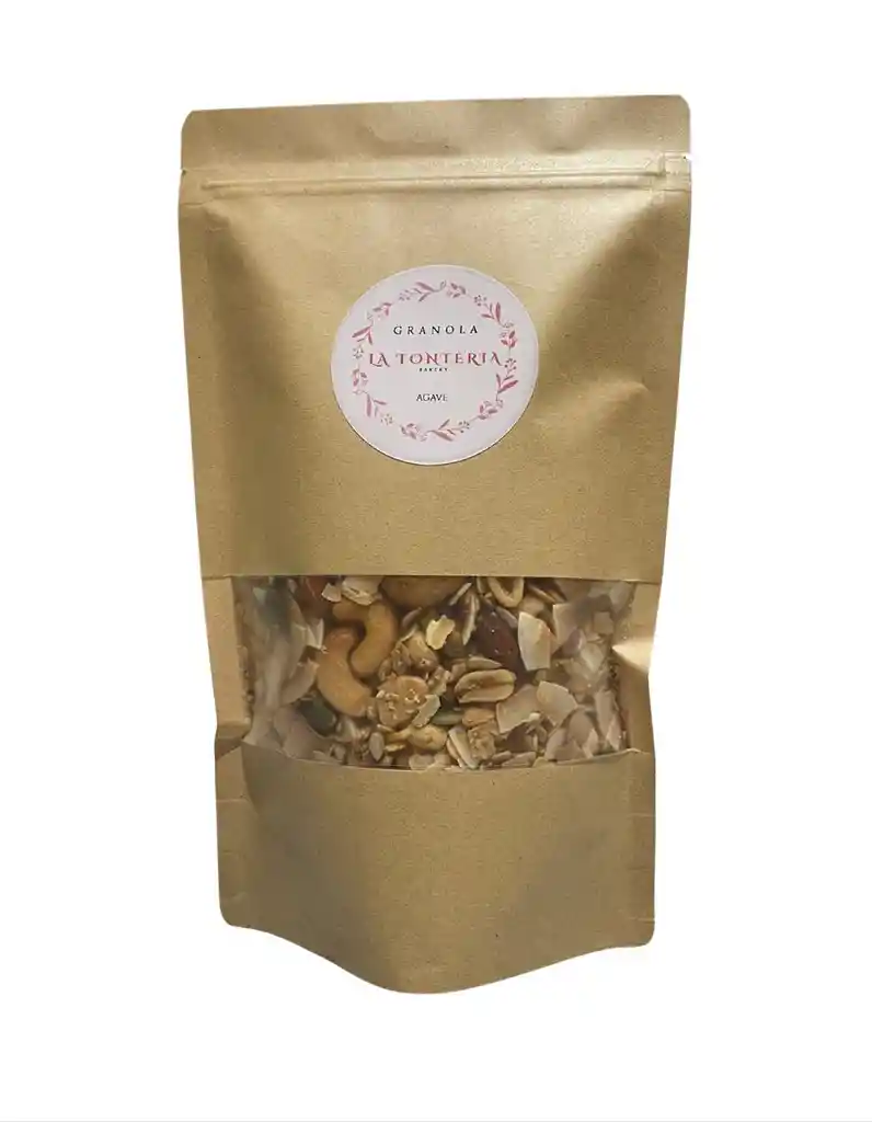 Granola natural, elaborada con Avena, Almendra entera y laminada, Semillas de girasol, Marañón, Pistachos, Semillas de Calabaza, Ajonjolí, Nuez del Brasil, Aceite de Coco, Semillas de Chía, Linaza, Hojuelas de Coco, Esencia de Vainilla, endulzada con Miel de Agave.