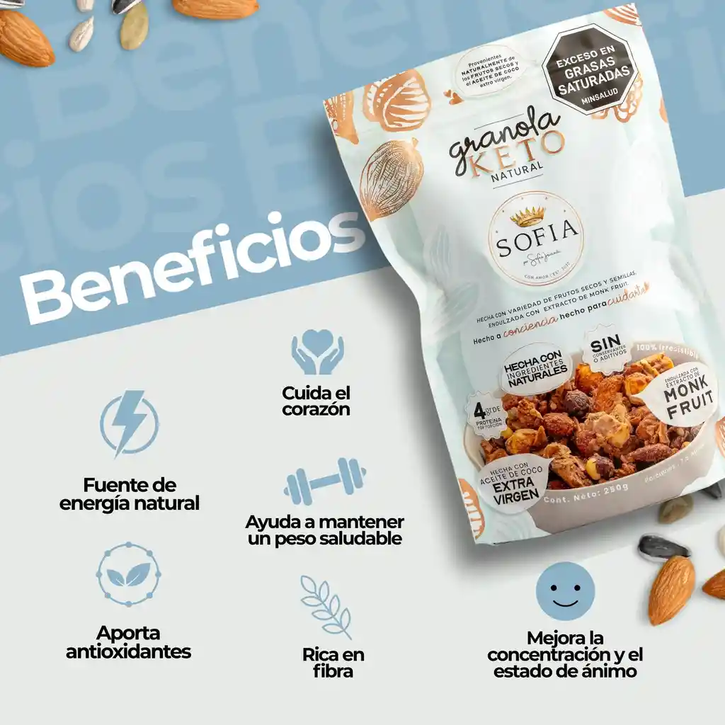 La granola keto natural contiene: Coco en escamas, Almendra entera, Extracto de Monk Fruit (Endulzante natural Siraitia Grosvenorii), Semillas de girasol, Nuez del Brasil, Aceite de coco extra virgen, Crema de maní, Claras de huevo, Nuez del nogal, Macadamia, Avellana, Marañón, Semillas de calabaza, Canela en polvo, Extracto natural de Vainilla, Sal marina. Contiene 250 Gramos (7,5 porciones de 30G aprox) IDEAL PARA INCLUIRLA EN UNA DIETA KETO