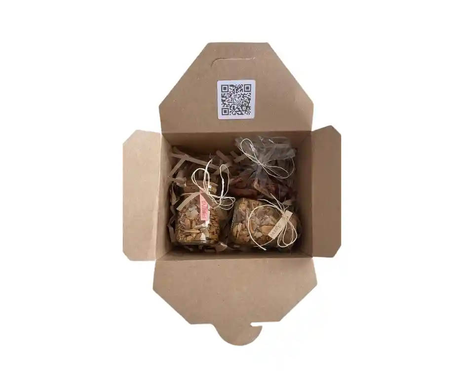Caja de Regalo con dos hermosos Envases de vidrio con 50grs cada uno, y Datiles Horneados. Super para Regalos!