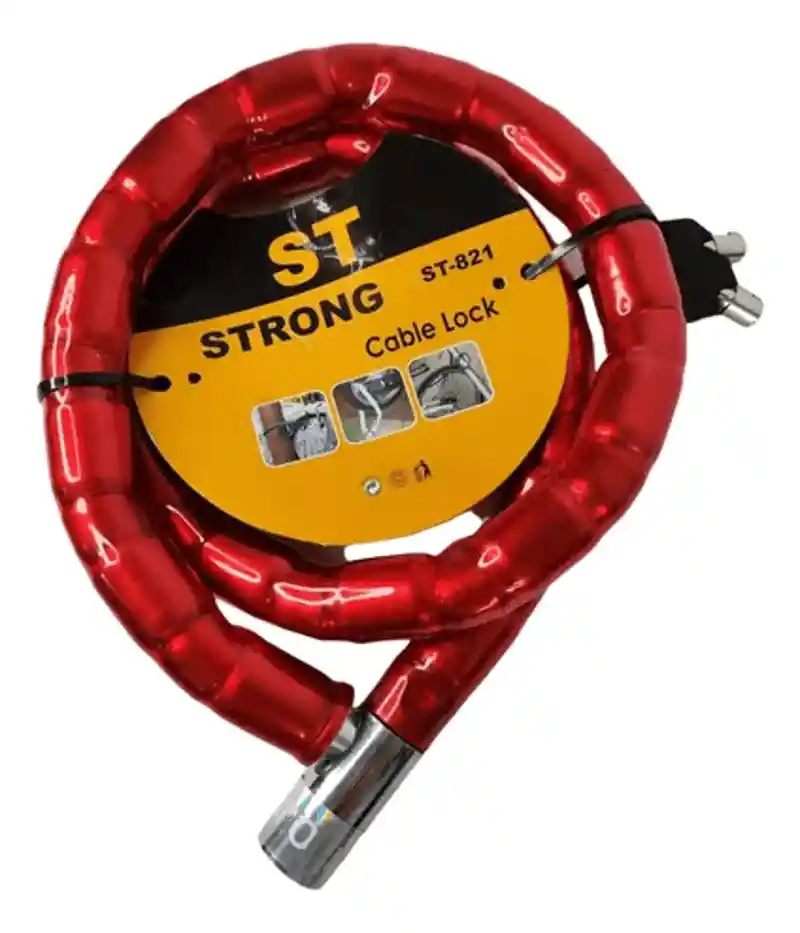 Cable interno de acero macizo con recubrimiento plástico resistente a la intemperie. Cuenta con sistema de cierre por llave y núcleo reforzado contra cortes. Diseño flexible y firme, ideal para asegurar partes de la moto o el casco en zonas de alto tránsito.