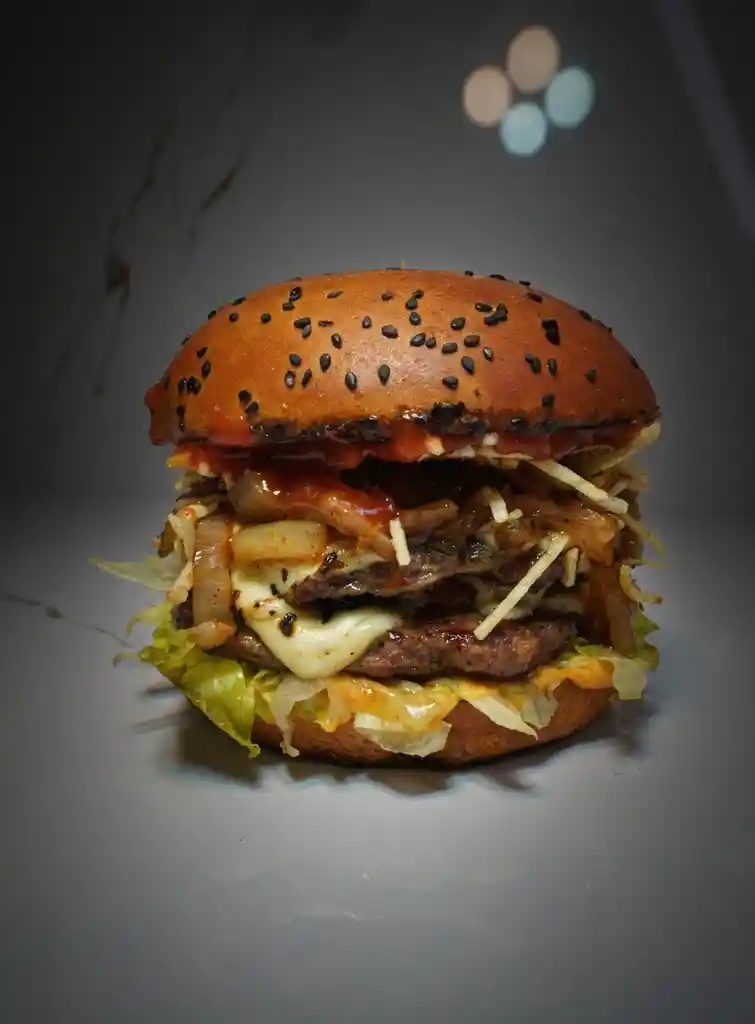 Hamburguesa artesanal con 240g de carne 100% res (doble porción), pan mantequilla con ajonjolí negro, doble queso mozzarella fundido, cebolla caramelizada, tomate, lechuga y papa cabello de ángel crujiente. Más jugosa, más potente y con verdadero sabor parrillero.