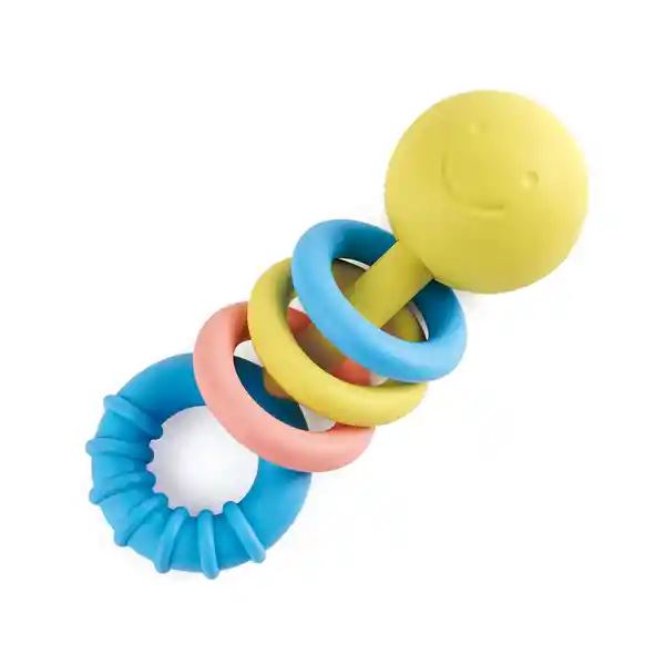 Hecha de un Material Seguro a Base de Arroz la Cara Feliz Viene Con Tres Anillos de Cascabeleo Móviles Para Estimular la Conciencia Sensorial y un Anillo de Mordedor Para Masticar. Edad Recomendada: 0 Meses