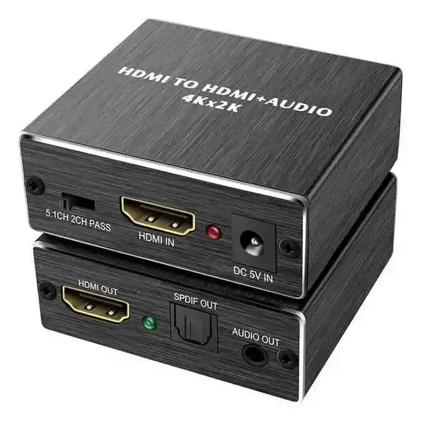 Dispositivo HDTV Audio Extractor diseñado para separar el audio de una señal HDMI y enviarlo a parlantes, audífonos, barras de sonido o amplificadores, manteniendo la salida de video hacia pantallas, monitores o televisores HDTV TO HDTV + AUDIO