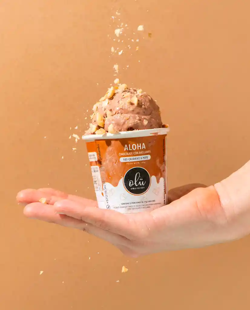 Helado aloha (Chocolate con avellanas) Helado de chocolate con avellanas, vegano, endulzado con stevia, monk fruit y eritritol. 52 calorías x porción – 104 calorías x pote Vida Útil: 6 meses
