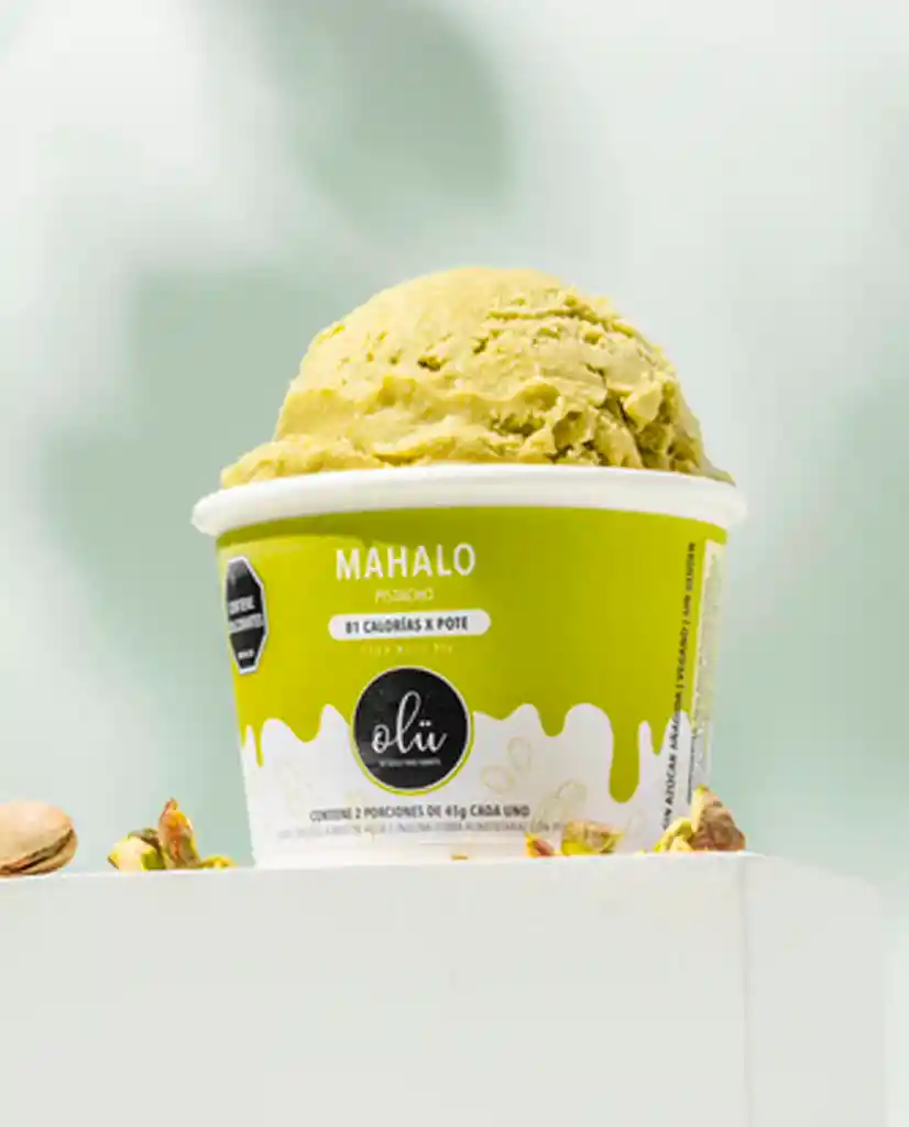 Helado mahalo (Pistacho) Helado de pistacho, vegano, endulzado con stevia, monk fruit y eritritol. 39 calorías x porción – 81 calorías x pote Vida Útil: 6 meses
