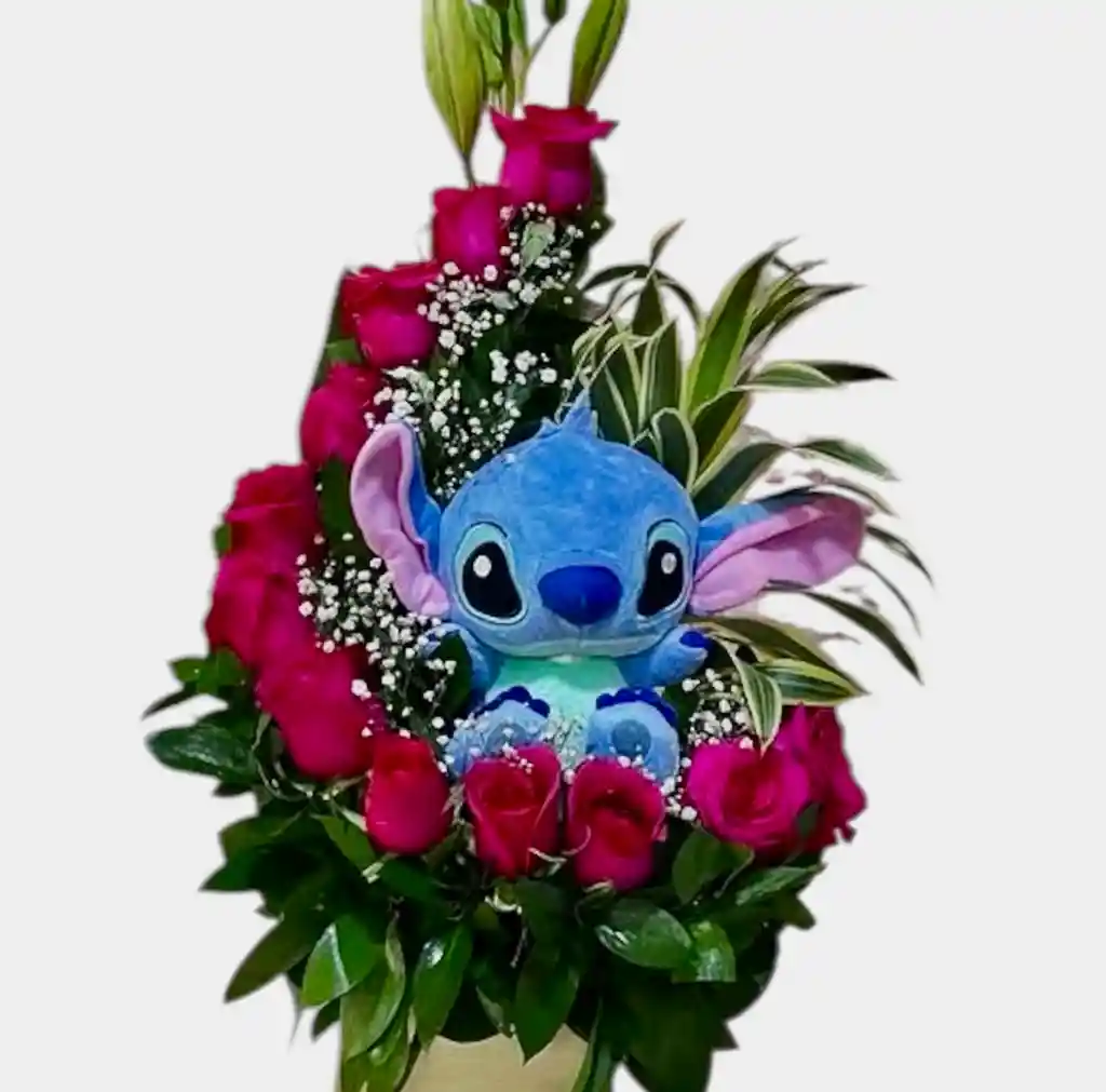 contiene 1 peluche stitch 14 rosas fuscias o rojas azucena blanca follaje verde tarjeta personalizada ramo de rosas ramo de peluches arreglo florar arreglo de rosas y peluches buquet de rosas feliz cumpleaños feliz día para mujer