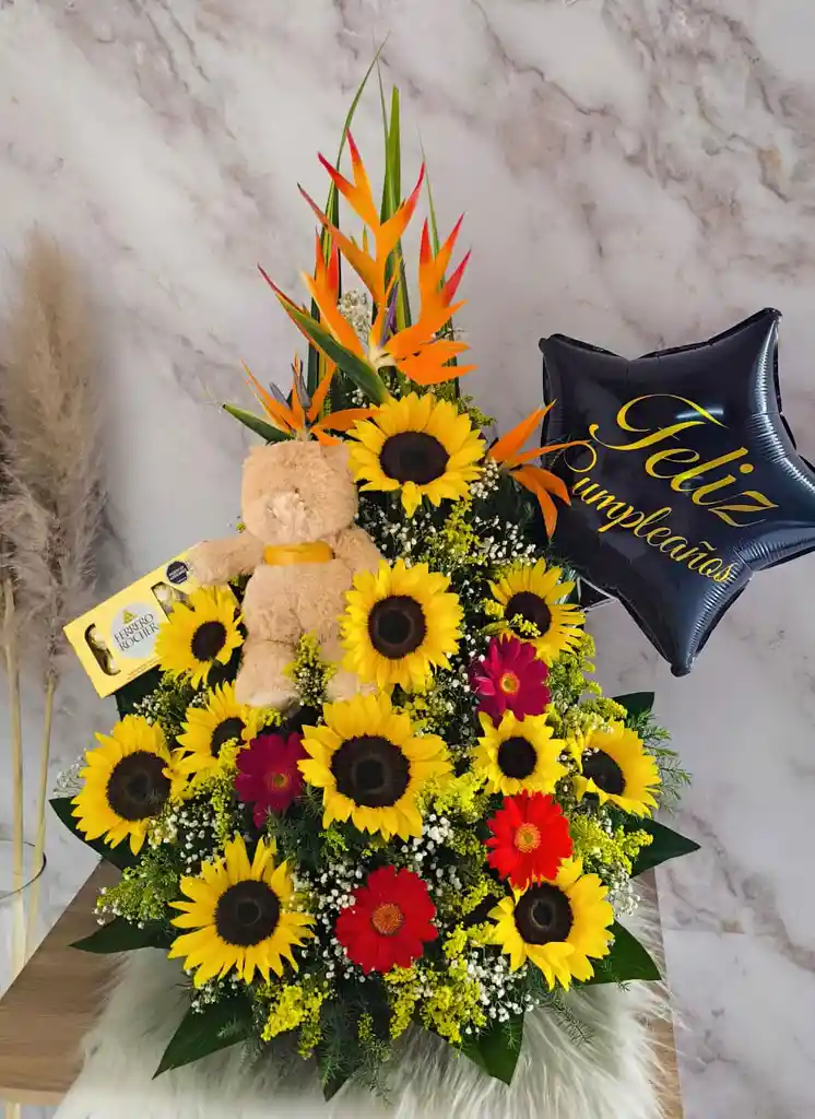 HERMOSO RAMO EN ROSAS, GIRASOLES CON PELUCHE, GLOBO Y FERRERO ROCHE