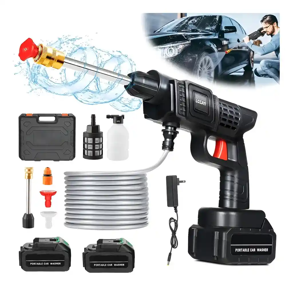 Su diseño compacto y autonomía la convierten en una solución ideal para tareas de limpieza en lugares sin acceso a electricidad o agua corriente, ofreciendo flexibilidad y eficiencia en cada uso. DESCRIPCION La hidrolavadora sencilla de doble batería es una herramienta portátil y eficiente diseñada para facilitar la limpieza de diversas superficies sin depender de una fuente de energía fija. Con una presión máxima de hasta 45 bares y un caudal de 270 litros por hora, esta hidrolavadora es capaz de eliminar suciedad incrustada en patios, vehículos, fachadas y más. Su diseño inalámbrico y ligero, con un peso aproximado de 2 kg, permite una movilidad sin restricciones, y su sistema de doble batería de litio proporciona una autonomía de entre 30 y 45 minutos, dependiendo de la intensidad de uso. Además, incluye una variedad de accesorios, como boquillas ajustables y mangueras, que permiten adaptar el chorro de agua a diferentes necesidades de limpieza. La capacidad de extraer agua de diversas fuentes, como cubos o botellas, añade versatilidad a su uso en distintos entornos. Características del producto: 1.-Presión máxima de 45 bares 2.-Caudal de 270 litros por hora 3.-Diseño inalámbrico y portátil 4.-Peso aproximado de 2 kg 5.-Autonomía de 30 a 45 minutos 6.-Incluye boquillas ajustables 7.-Manguera de 5 metros 8.-Capacidad de extraer agua de diversas fuentes 9.-Sistema de doble batería de litio 10.-Apta para limpieza de múltiples superficies QUE INCLUYE LA COMPRA x1 HIDROLAVADORA SENCILLA