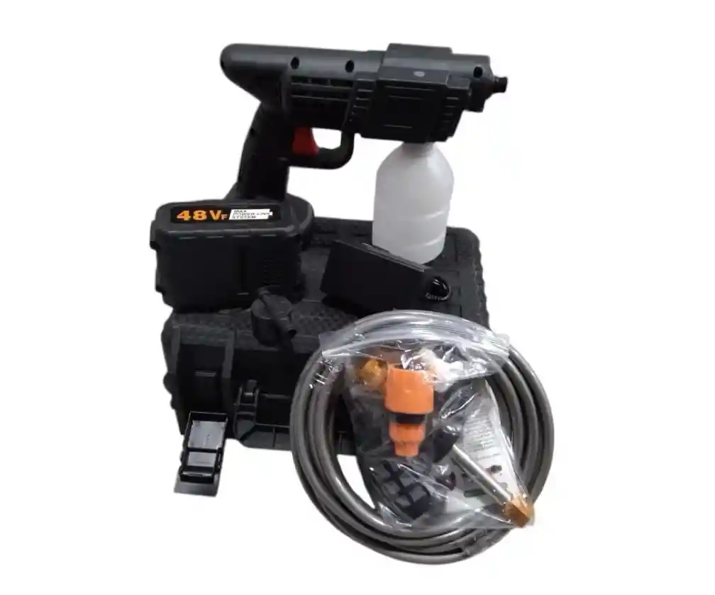 Diseñada para ofrecer comodidad y eficiencia, esta hidrolavadora recargable cuenta con una batería que proporciona la libertad de movimiento sin necesidad de cables. Su diseño compacto permite un fácil almacenamiento y transporte, ideal para tareas de limpieza en interiores y exteriores. Con su potencia adecuada, es perfecta para eliminar suciedad y manchas en diversas superficies donde quieras, como quieras sin cables ni mangueras estorbosas! ¿Cansado de buscar un enchufe o una llave de agua cerca para lavar tu auto? Con la Hidrolavadora Inalámbrica de Alta Presión, obtienes la potencia de una hidrolavadora profesional en la palma de tu mano. Gracias a su sistema de succión autónoma, puedes extraer agua directamente de un balde, un río o una piscina. ¡Es la solución definitiva para el hogar, el campo y los viajes! ¿Por qué elegir nuestra Hidrolavadora? Libertad Total: Sin cables. Incluye 1 Baterías de 48v de larga duración para que nunca dejes un trabajo a medias. Máxima Potencia: Presión de 70 PSI y flujo de 240 L/H, ideal para quitar barro, suciedad de fachadas, regar el jardín o bañar a tus mascotas. Ahorro Inteligente: Consume hasta un 80% menos agua que una manguera convencional, cuidando el planeta y tu bolsillo. Cargador de pared. Manguera de succión flexible. Filtro de agua. Mezclador de espuma (Tanque de jabón).