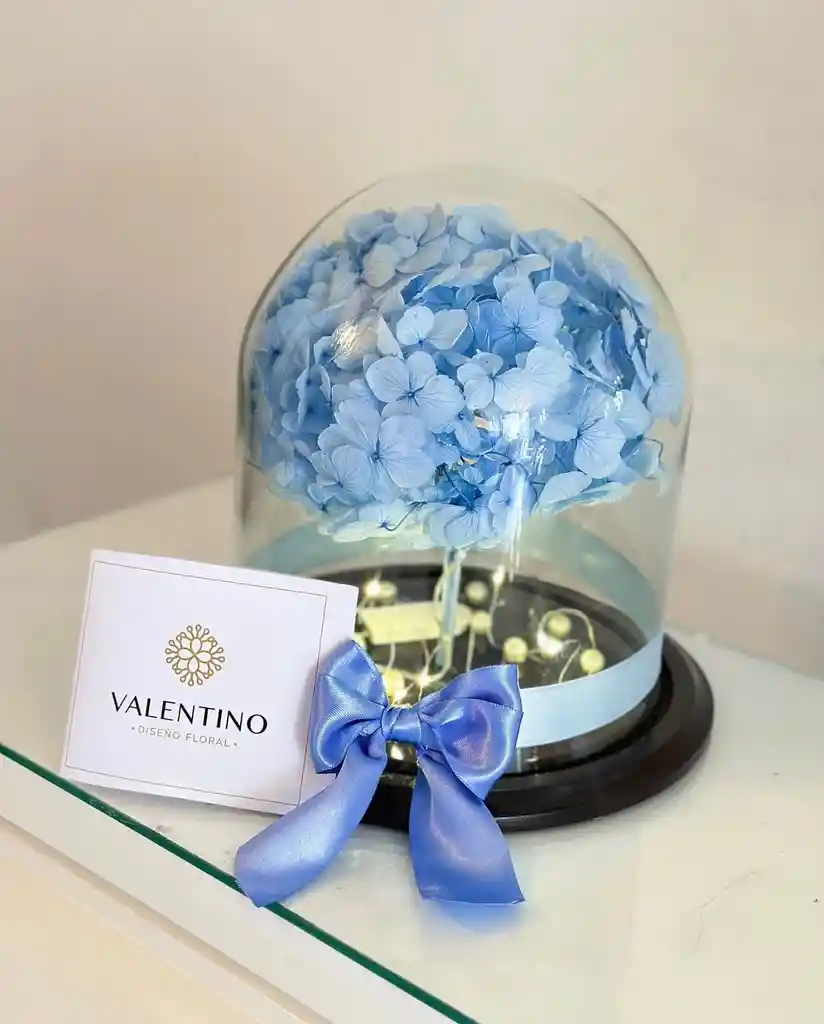 Hortensia preservada, dura aproximadamente 3 años, viene en una urna de cristal iluminada.