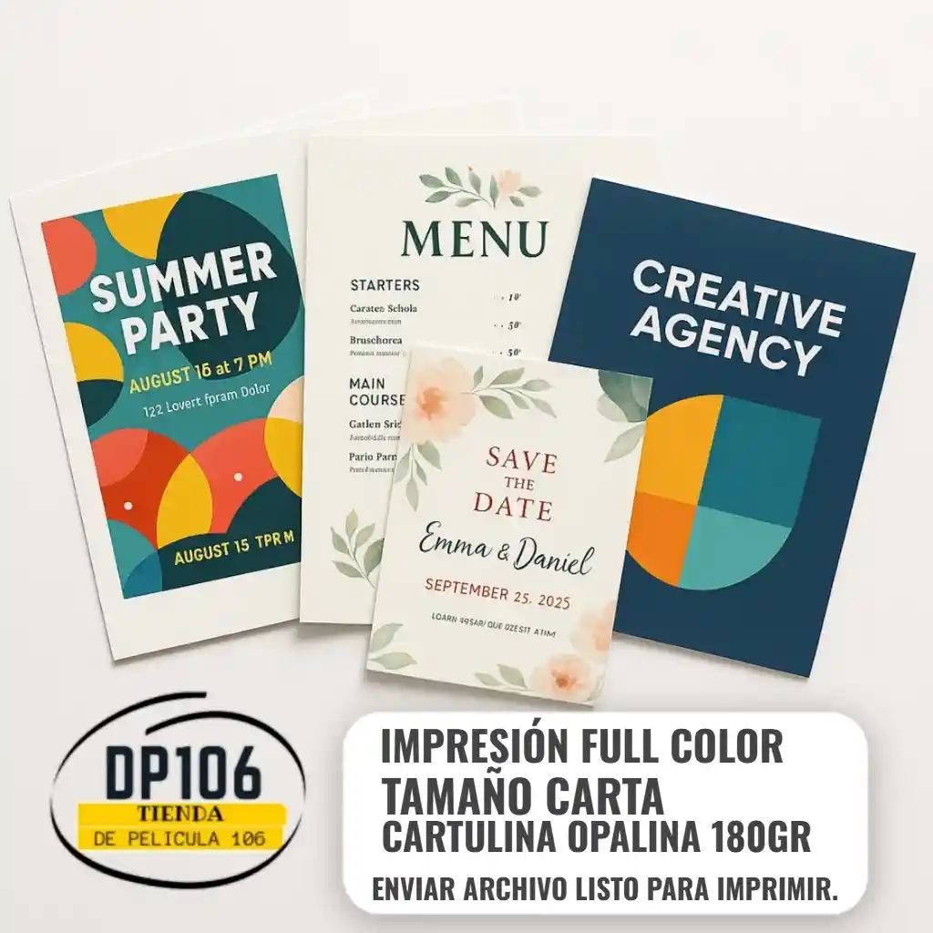 Dale vida a tus diseños con nuestra impresión profesional a todo color en cartulina opalina de 180 gramos, ideal para invitaciones, menús, afiches, flyers, portadas y más. Perfecta para quienes buscan calidad, rigidez y excelente presentación. ✅ Tamaño carta (21,5 x 28 cm) ✅ Impresión nítida y colores vibrantes ✅ Cartulina opalina 180g: firme, elegante y de alta calidad ✅ Ideal para trabajos escolares, corporativos o eventos 📩 Envía tu archivo ya listo para imprimir 📱 WhatsApp: 3165561600 📧 Correo: dp106@hotmail.com ¡Tu diseño, con nuestra calidad! ENVIAR ARCHIVO YA LISTO.