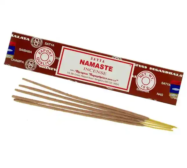 INCIENSO NAG CHAMPA SATYA NAMASTE DE LA INDIA. Caja de 15g. Descripción: Incienso original NAG CHAMPA aroma NAMASTE Caja de 15 gramos que contiene entre 8 a 15 varitas dependiendo del peso de las mismas. Tiempo de quemado: 45 minutos aproximadamente. El incienso Satya Namaste es una mezcla tradicional hecha a mano en la India, caracterizada por un aroma rico, dulce, floral y terroso, diseñado para crear un ambiente armonioso, relajante y festivo. Es ideal para la meditación, yoga y reuniones sociales, promoviendo la paz, la conexión espiritual y la calidez en el hogar.
