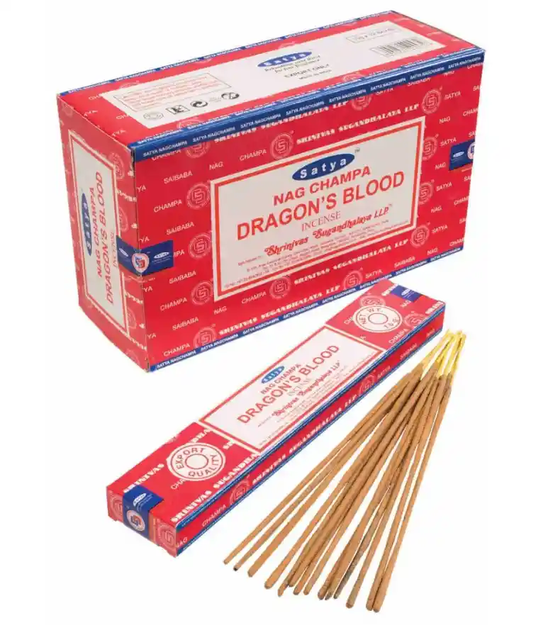 INCIENSO NAG CHAMPA SATYA SANGRE DE DRAGÓN DE LA INDIA. Caja de 15g. Descripción: Incienso original Satya Sai Baba aroma SANGRE DE DRAGÓN Caja de 15 gramos que contiene entre 8 a 15 varitas dependiendo del peso de las mismas. El incienso de Sangre de Dragón es una resina rojiza del árbol Dracaena, usada en rituales para protección, purificación, meditación y para potenciar hechizos, creando un ambiente de calma y enfocando la energía su aroma es dulce, especiado y amaderado, popular en chamanismo y prácticas espirituales para sellar energías y atraer amor, además de tener usos medicinales tradicionales. Tiempo de quemado: 45 minutos aproximadamente.