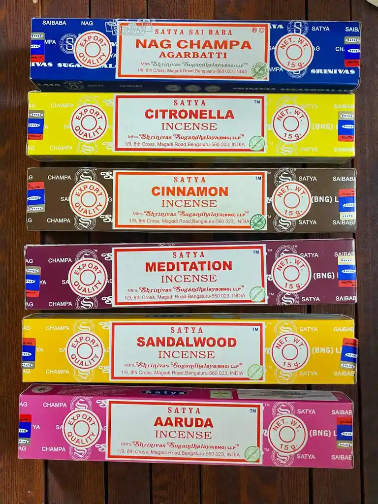 6 Cajas de Incienso Satya Aromas Mix Surtidos 15gr c/u. Aromas: Nag Champa, Citronela, Canela, Meditación, Sándalo y Ruda, uno de cada uno. En el top 1 de Mejores Marcas/Aromas de Incienso a nivel mundial, es el Satya Sai Baba, por su alta calidad y sus significados. Experimente la profundidad de los aromas con el Satya Nag Champa Mix Aromas, un conjunto de seis cajas de varillas de incienso que evocan la armonía y la serenidad. Cada varilla está elaborada con una mezcla equilibrada de resina de sándalo, flores frescas, aceites esenciales y hierbas naturales, diseñada para crear un ambiente relajante en cualquier espacio.