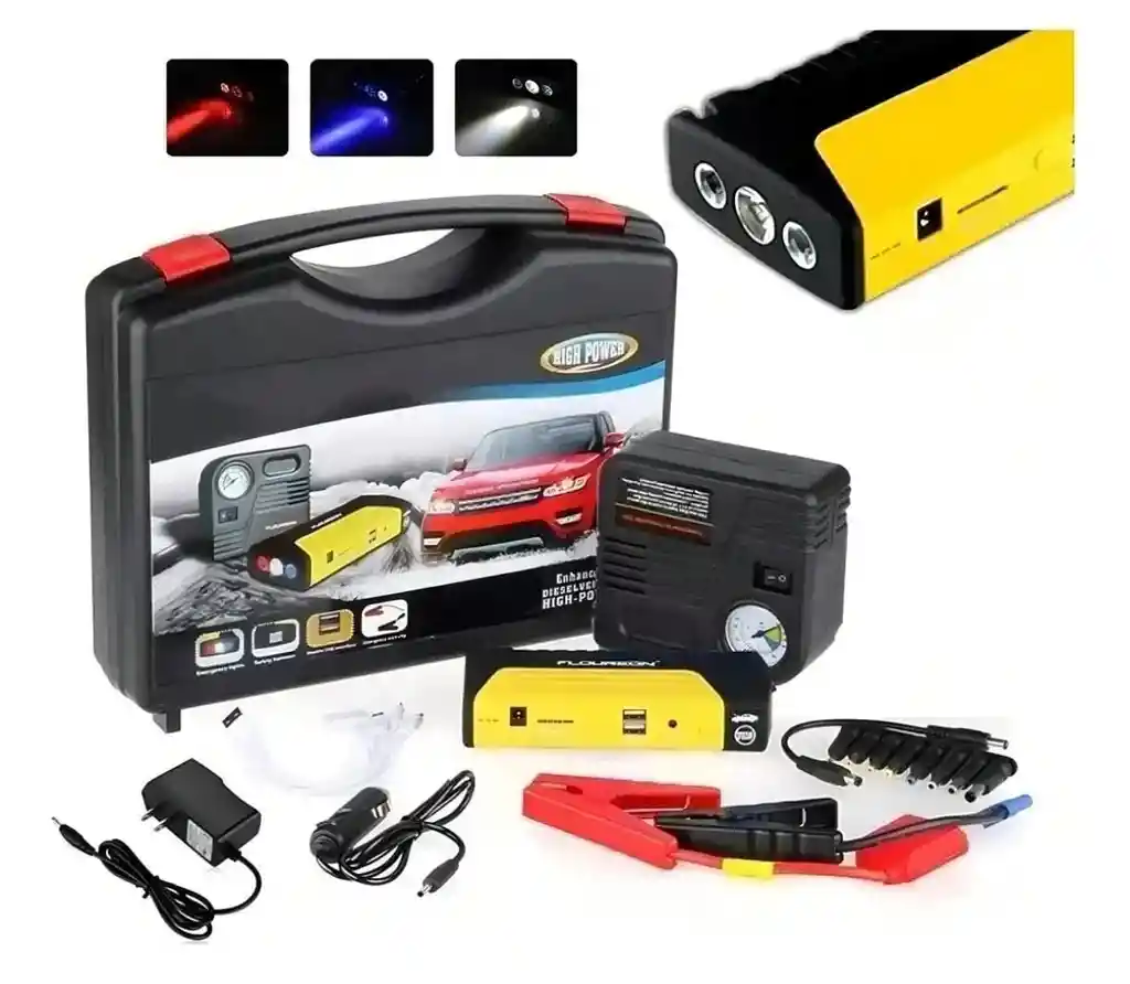 🔋 Compresor con Iniciador de Batería 12V – Multifuncional de Alta Potencia Equipo portátil y potente diseñado para emergencias automotrices y uso diario. Combina iniciador de batería, compresor de aire, linterna LED y power bank, todo en un solo dispositivo compacto y fácil de transportar. ⭐ Características principales: ✅ Iniciador de batería 12V: Arranca vehículos como carros, camionetas y motos con batería descargada. 🚗 Compresor de aire integrado: Ideal para inflar llantas de autos, motos, bicicletas y balones. 🔦 Linterna LED de alta intensidad: Incluye luces de emergencia para uso nocturno o situaciones de riesgo. 🔌 Power Bank multifunción: Puertos USB para cargar celulares, tablets y otros dispositivos electrónicos. 🧳 Diseño portátil con estuche rígido: Fácil de transportar y almacenar en el vehículo. 🔒 Sistema de seguridad integrado: Protección contra sobrecarga, cortocircuito y polaridad inversa. ⚡ Alta potencia y rendimiento: Respuesta rápida y confiable en situaciones de emergencia. 📦 Incluye: Cables con pinzas para batería Adaptadores de carga Boquillas para inflado Cargador Manual de usuario 🔧 Ideal para llevar en el carro, viajes largos o como respaldo ante emergencias. Un producto práctico, seguro y confiable que no puede faltar