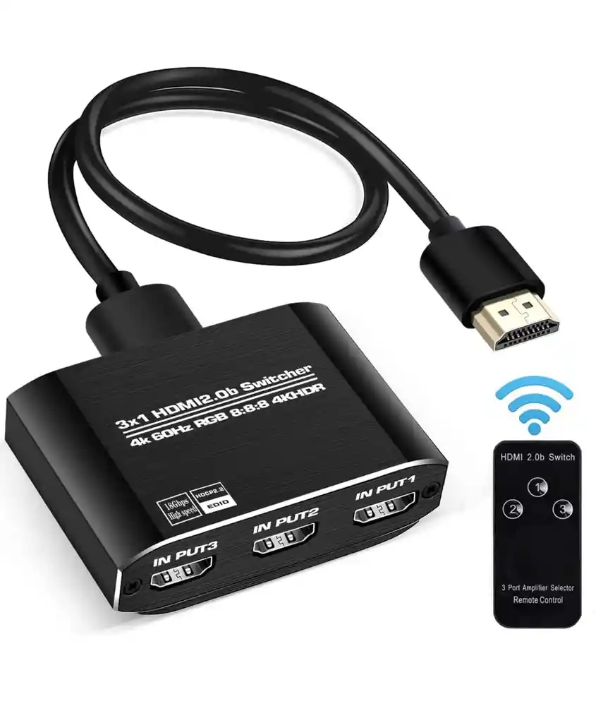 Funcionalidad 3 en 1: Permite conectar hasta 3 dispositivos HDMI (como PS4, Xbox, PC, Roku) a una sola pantalla o TV, transmitiendo audio y video sin pérdida de señal. Alta Calidad de Imagen: Cuenta con la última versión HDMI V2.0b, soportando resolución 4K a 60Hz, HDR, 3D y un ancho de banda de 18.5 Gbps. Audio Compatible: Soporta prácticamente todos los formatos de audio disponibles, incluyendo Dolby Atmos, DTS:X y Dolby Digital. Control Cómodo: Incluye un control remoto (hasta 5 metros de alcance) y un botón manual en el dispositivo para cambiar de entrada fácilmente. Durabilidad: Su carcasa es de aluminio, lo que ayuda a disipar el calor, evita la corrosión y lo hace más resistente. ⚠️ Nota sobre Apple: La función de cambio automático de entrada no funciona con Apple TV, ya que este dispositivo no se apaga completamente (se queda en suspensión), por lo que el interruptor no detecta el cambio de señal.