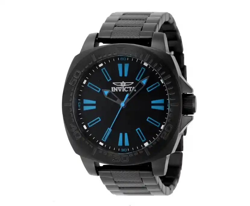 Caja y brazalete de acero inoxidable en color negro, diseño deportivo tipo cronógrafo, movimiento de cuarzo preciso y cristal resistente. Esfera moderna con subesferas, marcadores luminosos y buena resistencia al agua para uso diario.