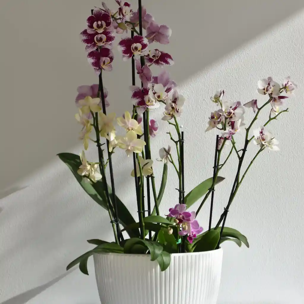 (Escribe en el chat el mensaje para la tarjeta) Una composición elegante, viva y absolutamente memorable 🌸 Nuestro Jardín de Orquídeas Vivas reúne diferentes alturas y formas en un arreglo sofisticado que transforma cualquier espacio o regalo en algo extraordinario. ✨ Incluye: • 1 Orquídea Premium • 2 Orquídeas Medianas (Multiflora) • 2 Mini Orquídeas 📏 Diámetro aproximado: 36 cm 🪴 Altura de la matera: 16 cm 🌿 Altura de las plantas: entre 50 y 70 cm (aprox.) Cada jardín es una pieza única. Al trabajar con orquídeas 100% naturales y VIVAS, los tonos, formas y floración pueden presentar ligeras variaciones respecto a la imagen de referencia. 🎨 Mix de colores: Las composiciones pueden variar según disponibilidad y colores de temporada. Incluye manual de cuidados para acompañar su florecimiento ✨ También puedes agregar una tarjeta personalizada para tu mensaje especial. Un regalo imponente, elegante y lleno de vida.