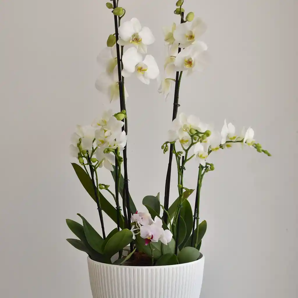 Elegante jardín con 5 orquídeas Incluye: • 1 Orquídea Premium • 2 Orquídeas Medianas (Multiflora) • 2 Mini Orquídeas