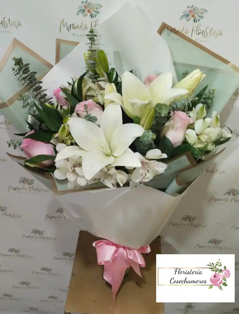 Bouquet con lirios y rosas en tonalidades pasteles