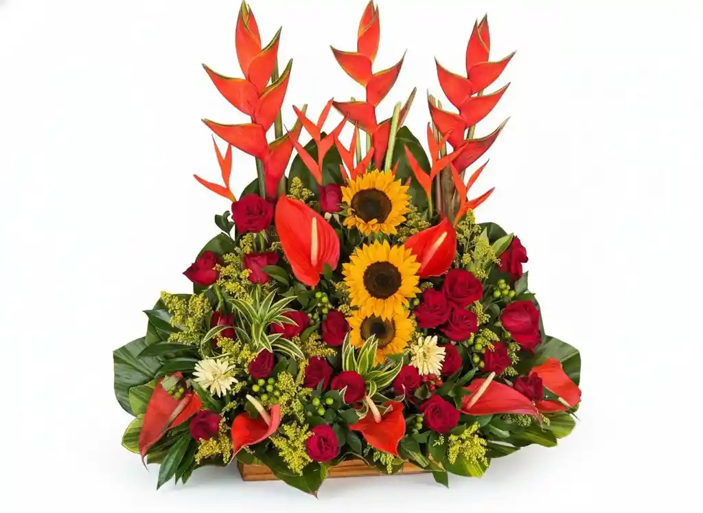 🌺 Jardín Tropical” – Una Explosión de Vida y Pasión 🌴 En Loren’s Floristería, hemos diseñado el “Jardín Tropical”, un arreglo floral que es mucho más que un regalo: es una obra de arte viviente, una sinfonía de colores y texturas creada para cualquier ocasión especial o para sorprender y cautivar profundamente. Este majestuoso diseño evoca la exuberancia de la naturaleza en su estado más puro. Composición y Lujo en Cada Detalle Cada elemento ha sido cuidadosamente seleccionado y dispuesto para crear un espectáculo visual inigualable: Corazones de Pasión (Rosas): La Rosas son el pilar de este jardín, aportando su eterno mensaje de amor, respeto y admiración. Su belleza clásica y su color intenso anclan el arreglo con sofisticación. Soles de Felicidad (Girasoles Grandes): Los imponentes Girasoles de gran tamaño irradian alegría, optimismo y vitalidad, actuando como focos de luz que llenan el arreglo de energía positiva. Toques de Alegría (Gerberas): Las vibrantes Gerberas se integran para añadir un estallido de felicidad, jovialidad y un color fresco que complementa la pasión de las rosas. Elegancia Exótica (Anturios): Los distintivos Anturios aportan su forma elegante y un brillo satinado, sumando una sofisticación tropical y un contraste de color que llama la atención. Alturas Majestuosas (Heliconias): Las espectaculares Heliconias se alzan con su estructura única y colores ardientes, aportando una verticalidad dramática y un inconfundible aire exótico, elevando el diseño a nuevas alturas. Base Verde Exuberante (Follajes): Cafeto: Su verde profundo y brillante sirve como un contraste clásico y lujoso. Masageana: Con sus hojas veteadas, añade una textura visual rica y dinámica. Copolio Verde Intenso: Proporciona un volumen denso y una base sólida de verde profundo que enmarca todas las flores. Canción de la India (Dracaena): Sus hojas con toques de color (rojo/rosado) añaden dinamismo y un toque exótico adicional.