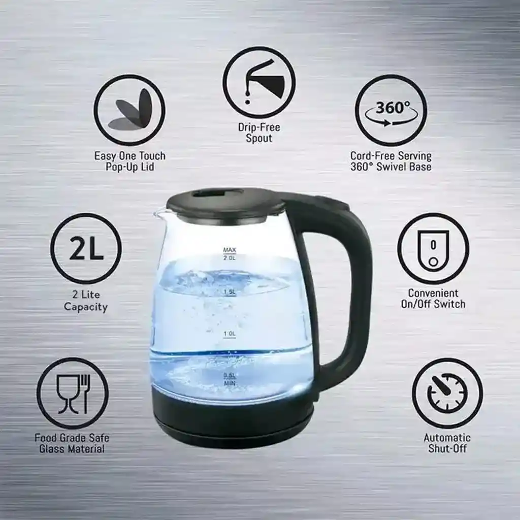 Capacidad: Cuenta con una capacidad máxima de 2.0 litros. Seguridad: Incluye protección contra funcionamiento en seco y apagado automático. Material: Jarra de vidrio transparente con diseño de base giratoria de 360 grados.