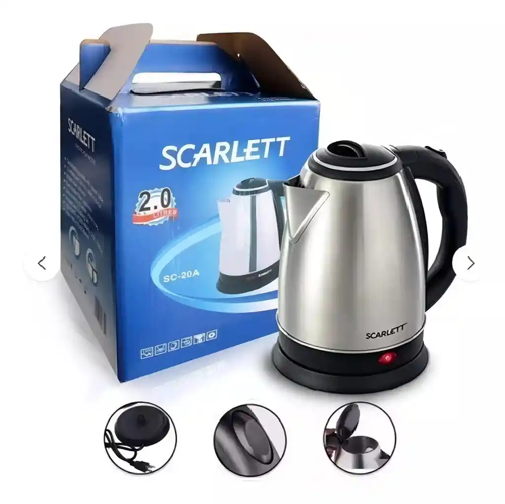 Tetera eléctrica * Hervidor eléctrico de acero inoxidable con base giratoria * Apagado de seguridad por sobrecalentamiento al hervir * Tapa con cierre de seguridad * Luz led roja indicadora * AC 110-120V 60Hz * 1.500W * Capacidad 1.8 litros * Medidas. 203 x 165 x 230 mm