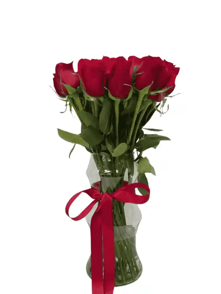 Un regalo que conquista corazones: rosas rojas en jarrón transparente, decorado con un moño sofisticado.