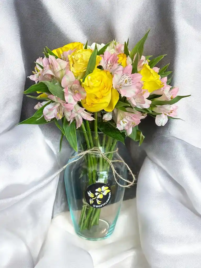 Jarrón de 12 rosas amarillas con 1 paquete de astromelia Nota: La flor puede ser sustituida dependiendo la disponibilidad de color y del producto “Mensaje Personalizado” máximo de 30 caracteres (Dejar el mensaje en el chat, los comentarios no se previsualizan para la tienda por lo que si se dejan allí no podrá ser incluido).