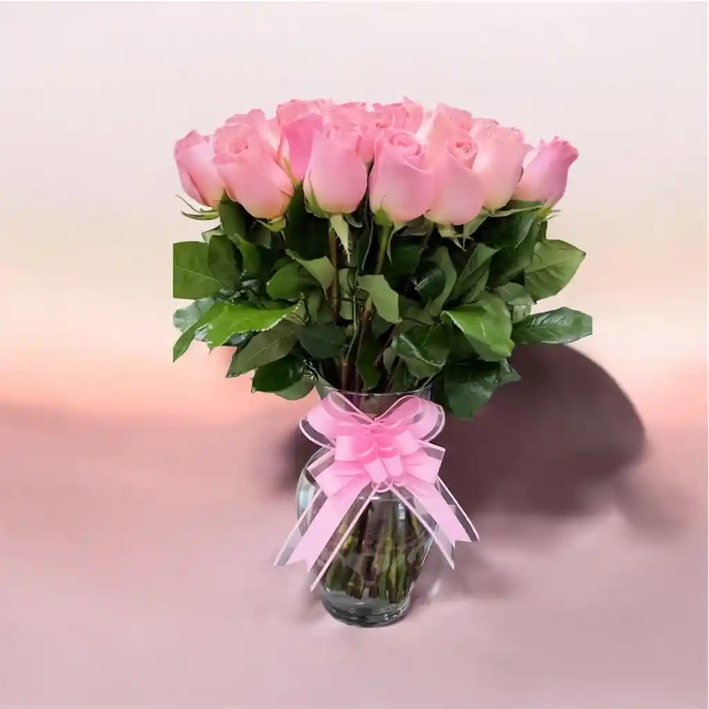 Contiene Jarrón de cristal Moño decorativo 48 rosas, rosadas Tarjeta personalizada