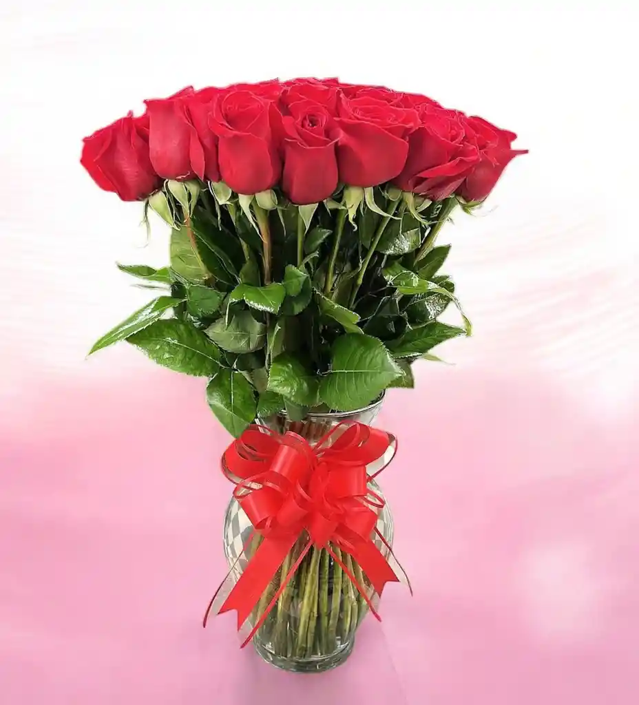 Contiene Jarrón vidrio moño decorativo 24. Rosas Rojas tarjeta personalizada