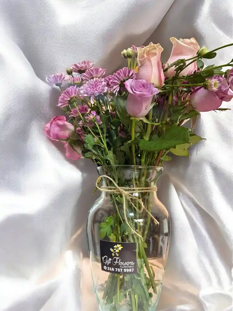 Jarron de 12 rosas rosadas y moradas acompañadas de margaritas moradas. Nota: La flor puede ser sustituida dependiendo la disponibilidad de color y del producto “Mensaje Personalizado” máximo de 30 caracteres (Dejar el mensaje en el chat, los comentarios no se previsualizan para la tienda por lo que si se dejan allí no podrá ser incluido).