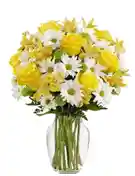 Jarrón amarillo de 12 rosas amarillas 1 paquete de margarita blanca y 1 paquete de astromelia amarillo con crisantemos verdes mini Nota: La flor puede ser sustituida dependiendo la disponibilidad de color y del producto “Mensaje Personalizado” máximo de 30 caracteres (Dejar el mensaje en el chat, los comentarios no se previsualizan para la tienda por lo que si se dejan allí no podrá ser incluido).