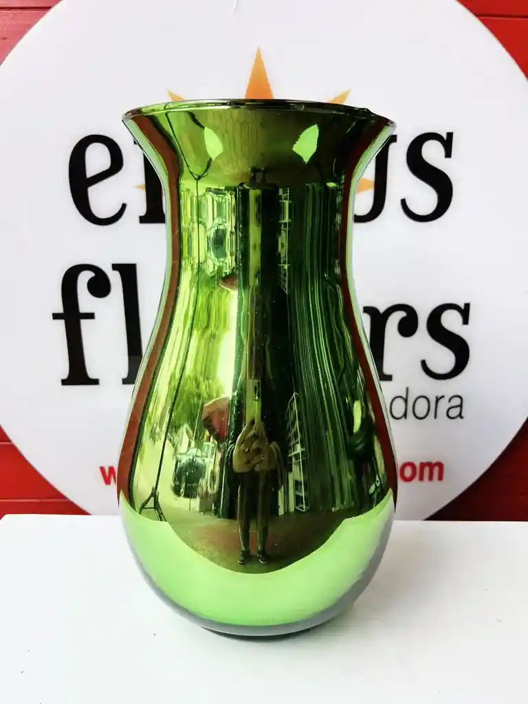Jarrón premium en vidrio hologramado, con altura de 35 cm, diseño moderno y llamativo, ideal para arreglos protagonistas y decoración sofisticada.