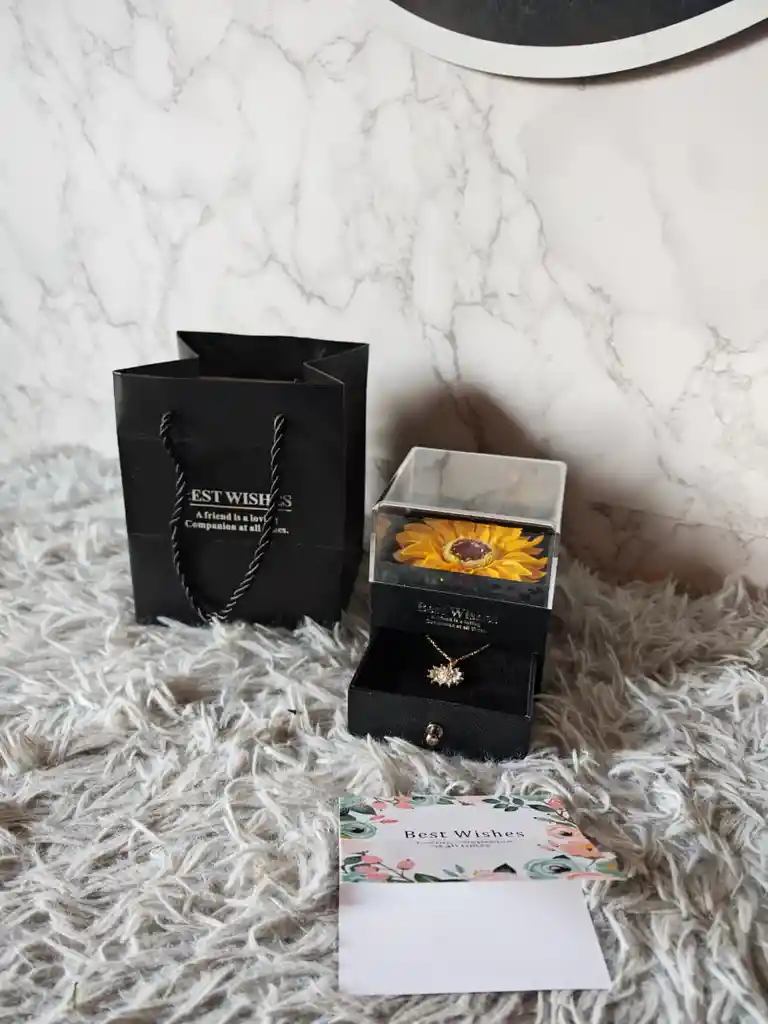 Elegante joyero decorado con un hermoso girasol que incluye una delicada cadena. Un detalle único y significativo, perfecto para sorprender con un regalo especial lleno de estilo y cariño.