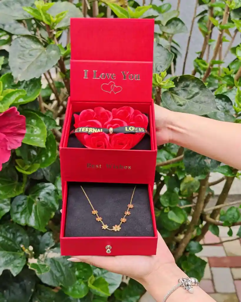 Hermoso joyero decorado con delicadas rosas y el mensaje “I Love You”, ideal para guardar accesorios especiales y sorprender con un detalle romántico lleno de significado.