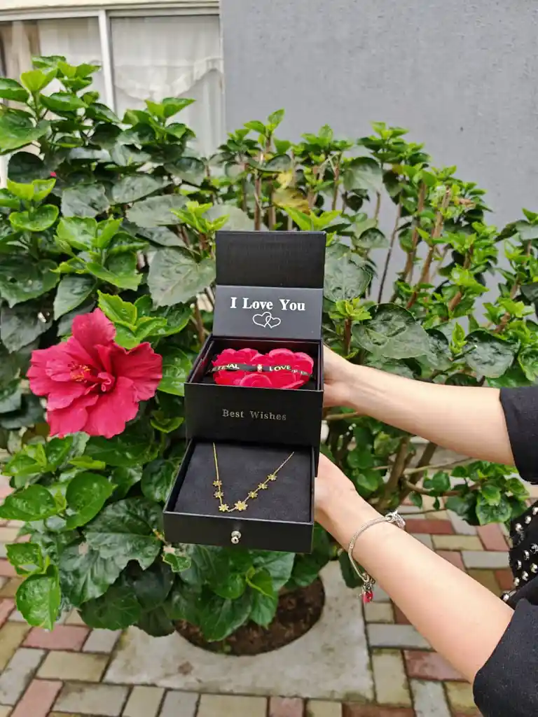 Hermoso joyero decorado con delicadas rosas y el mensaje “I Love You”, ideal para guardar accesorios especiales y sorprender con un detalle romántico lleno de significado.