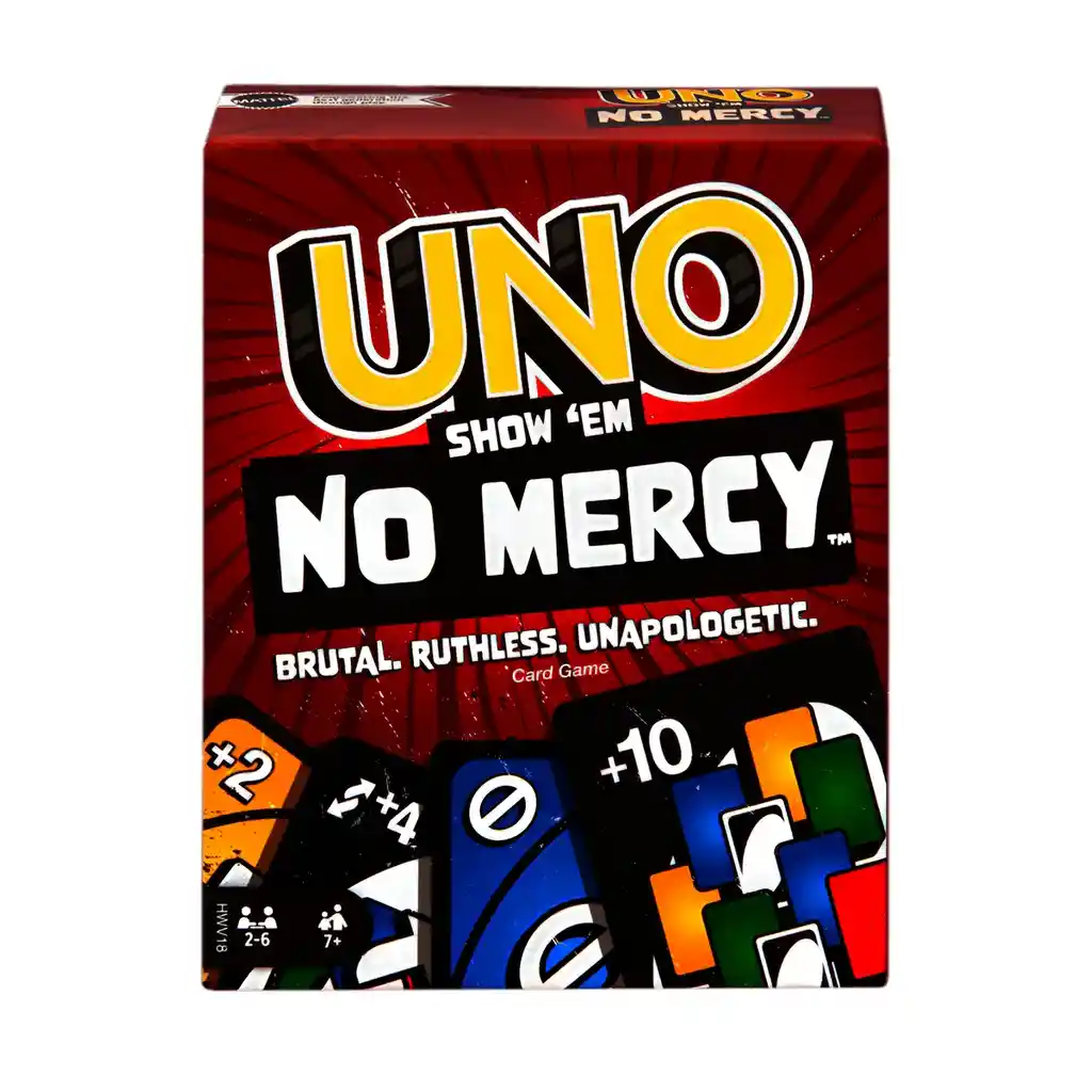 UNO No Mercy es un emocionante juego de cartas que lleva la diversión clásica de UNO a un nuevo nivel de intensidad, con reglas y cartas especiales que añaden un giro implacable a cada partida. Con opciones como +10, cambios de sentido y acciones estratégicas, este juego es ideal para desafiar a familiares y amigos en enfrentamientos llenos de tensión y risas. Diseñado para 2 a 6 jugadores a partir de 7 años, combina colores vibrantes, jugadas sorpresivas y una dinámica despiadada que pondrá a prueba tu astucia hasta el último momento. Ficha Técnica: Dimensiones de la carta ( Alt x Anch ) : 8,5 cm x 5,5 cm Edad recomendada: +7 años Material: Cartón con lamina brillante Cantidad de jugadores: 2–10 Jugadores Referencia: H-409 Certificado de conformidad: SL-CS-210044 ** _Para defectos de fábrica o retractos: \_Por favor revise el producto apenas lo reciba y antes de usarlo. No aplican ley de retracto o defectos de fábrica luego de usar el producto. Se manejan máximo 5 días para reportar defectos de fábrica (por ejemplo, producto funciona mal, piezas faltantes, rotas, etc). Para hacer efectiva la devolución el producto debe devolverse con el empaque original, el cual debe estar en buen estado, incluir todos los documentos y las partes completas y sin daños.