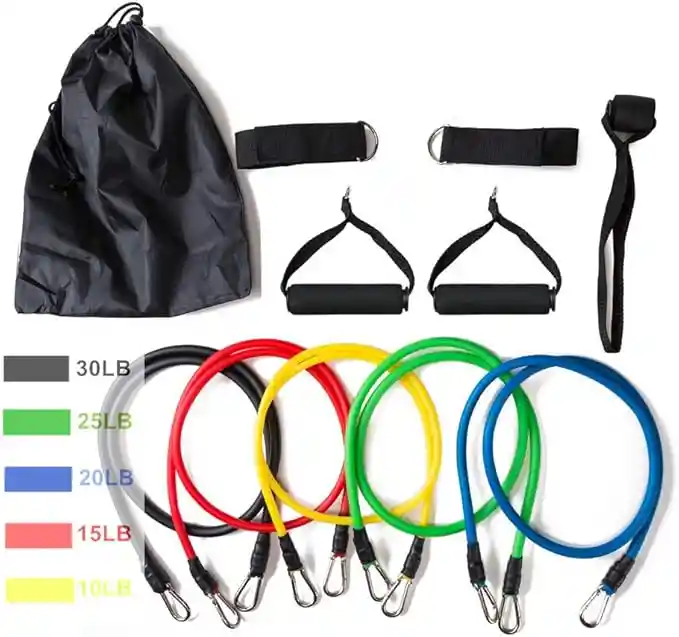 Características principales Niveles de Resistencia: Incluye 5 bandas con distintos niveles de resistencia, que van desde ultra ligero hasta extra fuerte, permitiendo personalizar la intensidad del ejercicio. Material Duradero: Fabricadas en látex de alta calidad, son resistentes y mantienen su elasticidad con el uso continuo. Versatilidad: Ideales para una amplia gama de actividades como yoga, pilates, fisioterapia, entrenamiento de fuerza y ejercicios de cuerpo completo. Portabilidad: El set es ligero y compacto, e incluye una bolsa de transporte que facilita su uso en casa, el gimnasio o durante viajes. Especificaciones del contenido El paquete generalmente incluye: 5 bandas de resistencia de diferentes colores/niveles. 2 asas o manijas de espuma acolchadas. 2 correas para tobillos. 1 anclaje para puerta. 1 bolsa de transporte. Estas bandas pueden usarse individualmente o combinadas para alcanzar niveles de resistencia de hasta aproximadamente 115 libras.